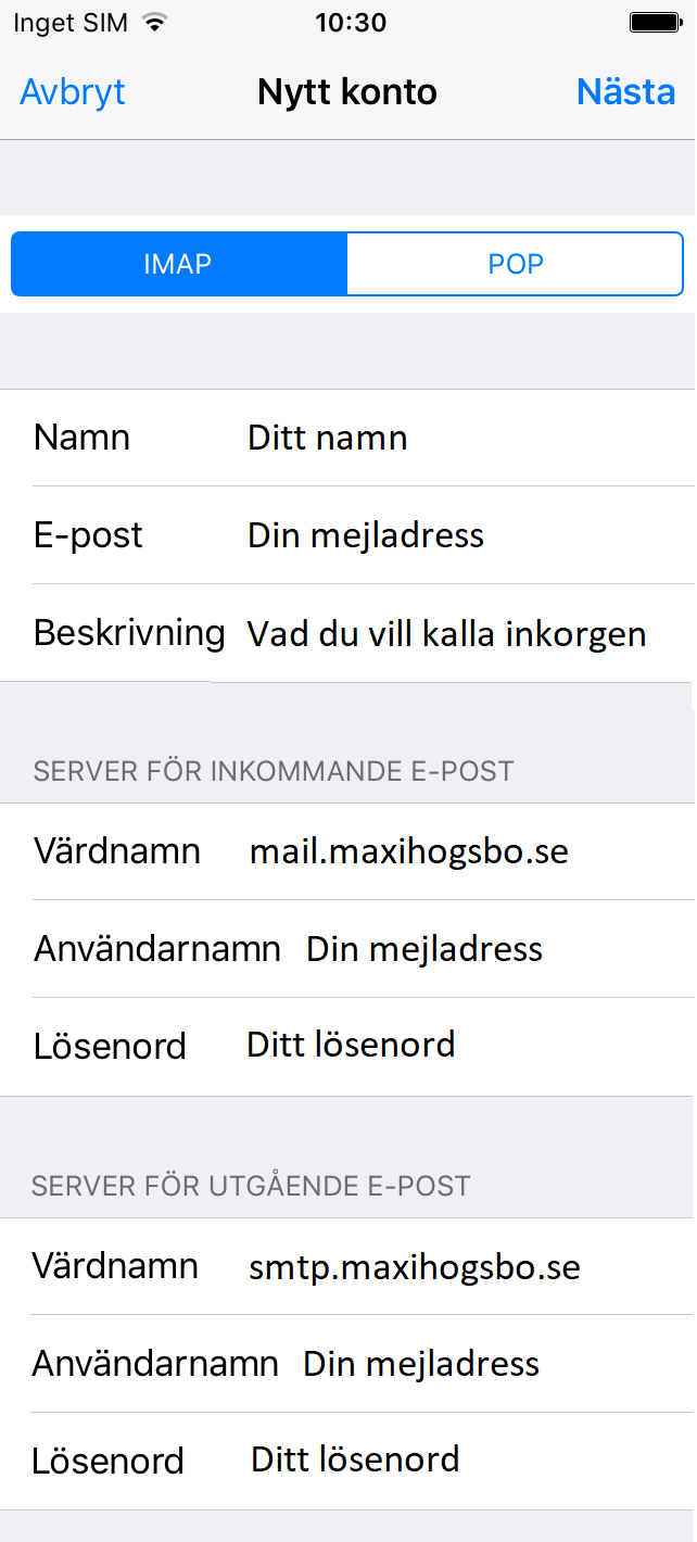 Fyll i uppgifterna som bilden nedan (Lösenord som till webmejl)