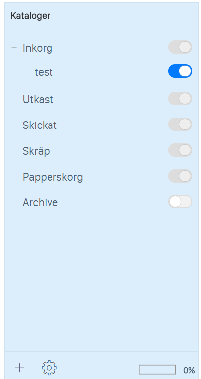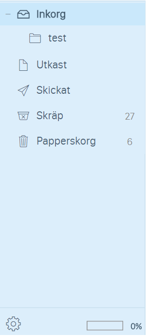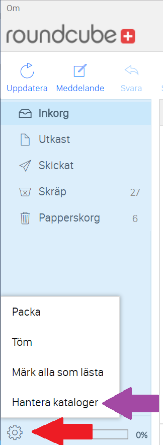 För att lägga till mappar i webmejlen, klicka på kugghjulet längst ner till vänster (röd pil)