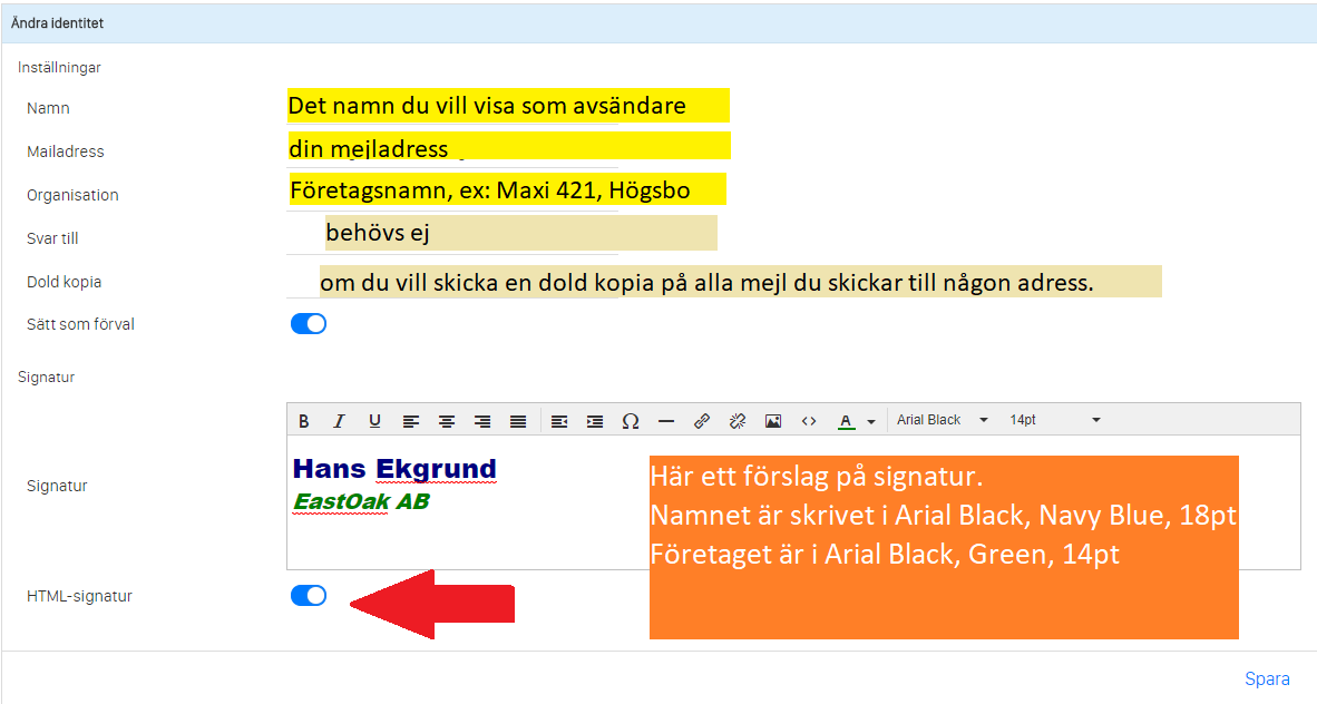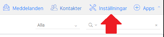 För att lägga till eller redigera din signatur i webmejlen, klicka på Inställningar överst till höger (röd pil)