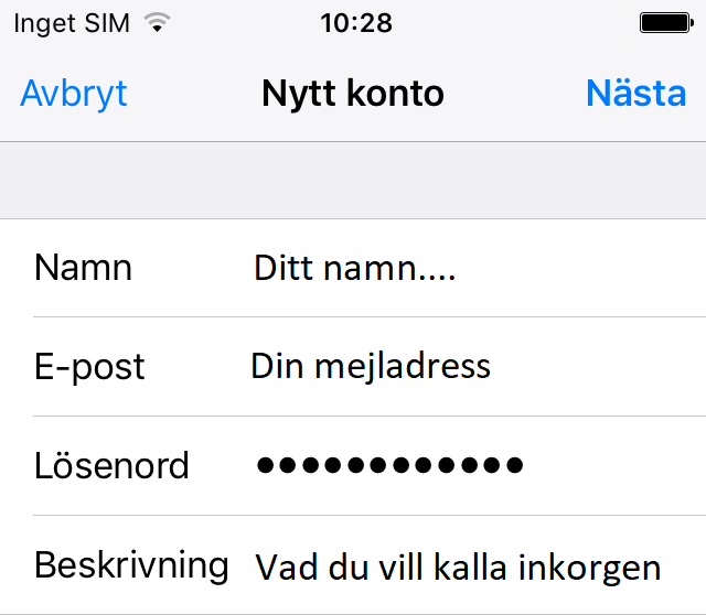 Fyll i uppgifterna som bilden nedan (Lösenord som till webmejl)